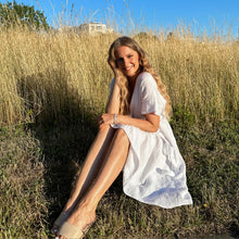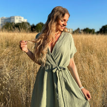 Unser Elis Musselin Sommer/ Strandkleid aus Musselinstoff mit überlappendem Design und kurzen Ärmeln. Die figurbetonte Passform unterstreicht den aparten Modestil. Perfekt als leichter Überzug, über einen Bikini oder Badeanzug.