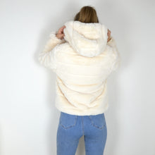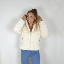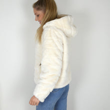 Unsere Fluffy Jacket ist eine flauschige kurze Jacke aus Kunstpelz mit Kaputze, Reißverschluss und verschließbaren Seitentaschen.